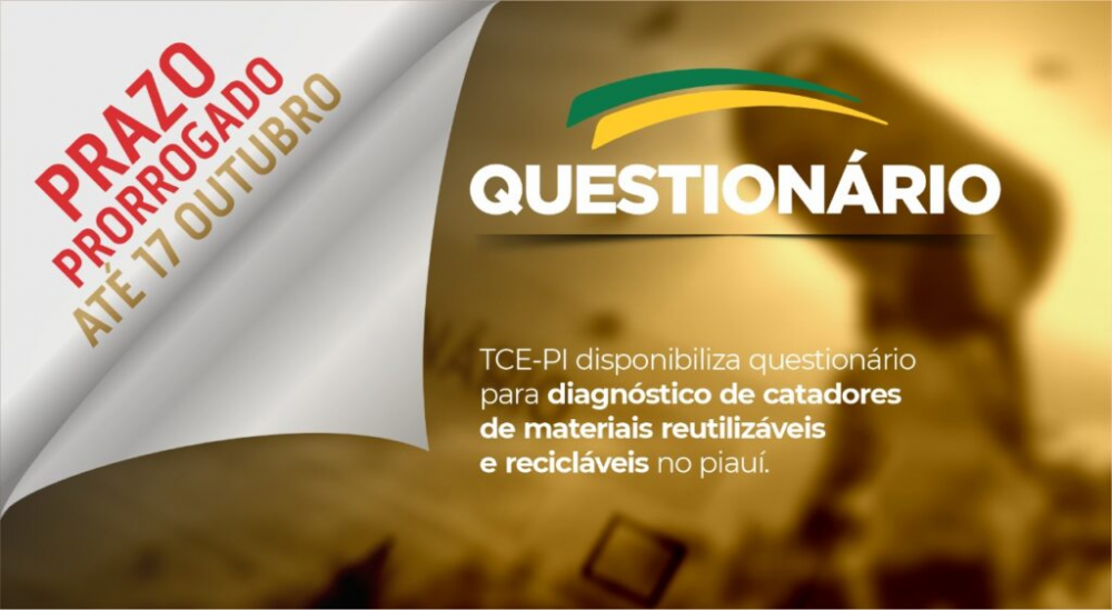 O Tribunal de Contas do Estado do Piauí (TCE-PI) prorrogou até o dia 17 de outubro, próxima segunda-feira, o prazo que as 224 Prefeituras Municipais, por meio do sistema Capture, respondam ao questionário sobre o levantamento de informações acerca da situação dos catadores de materiais reutilizáveis e recicláveis do estado do Piauí. A ação está sendo realizada pelo Grupo de Trabalho instituído pelo Termo de Cooperação publicado no Diário Oficial Eletrônico (DOE) de 01/12/2021, sendo formado pelo TCE-PI, pelo Governo do Estado do Piauí, por meio da Secretaria de Estado do Meio Ambiente e Recursos Hídricos (SEMAR), e pelo Ministério Público do Estado do Piauí (MPPI). O TCE Piauí reforça a importância de todos os municípios responderem a esse questionário.