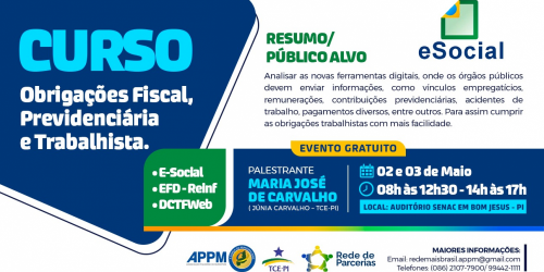 APPM e TCE-PI ofertam curso sobre Obrigações Fiscal, Previdenciária e Trabalhista - E-Social - EFD – Reinf – DCTFWeb em Bom Jesus ...