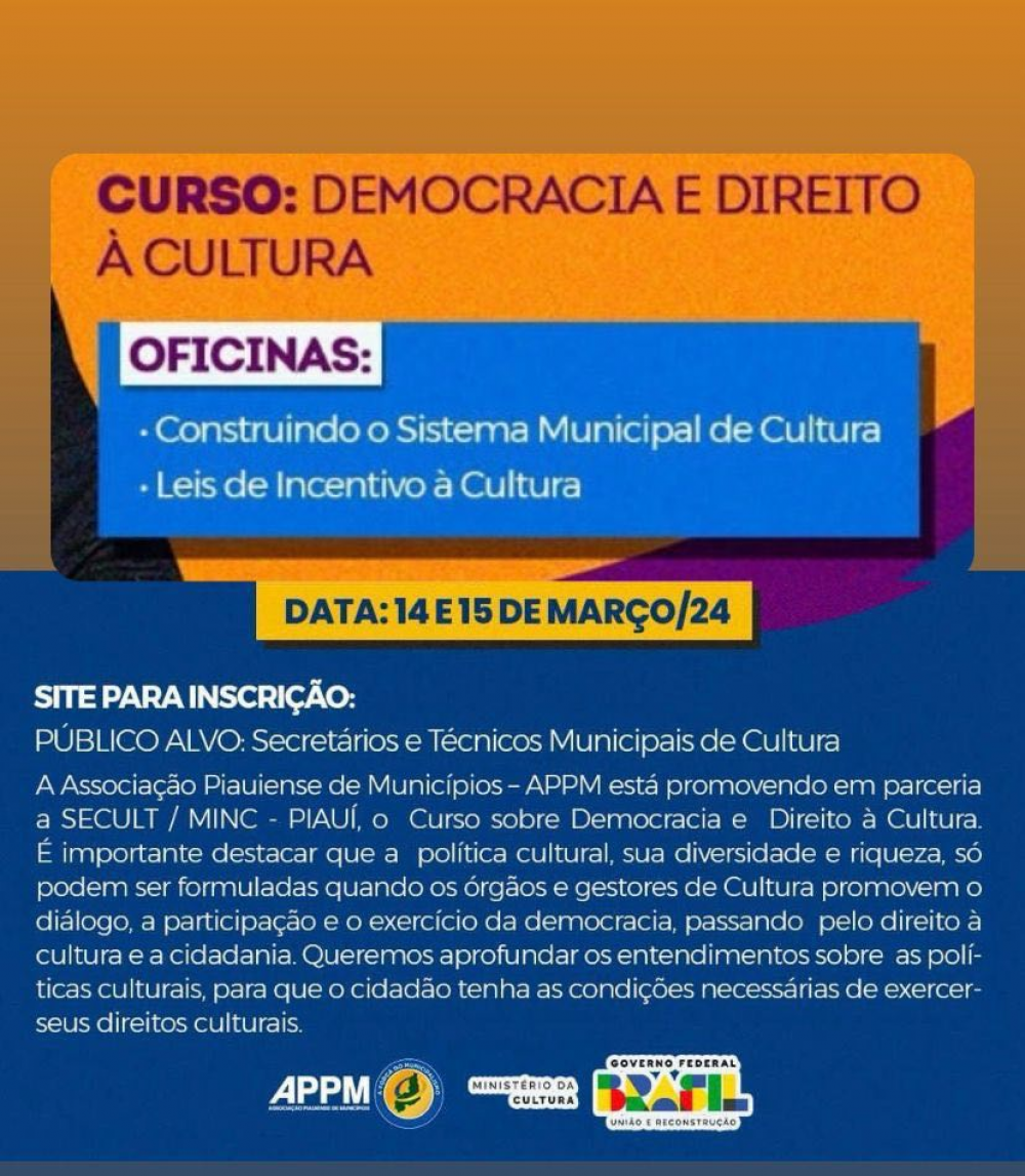 A Associação Piauiense de Municípios (APPM), em parceria a SECULT / MINC - PIAUÍ, promoverão, nos dias 14 e 15 de março, o Curso: Democracia e Direito à Cultura. É importante destacar que a política cultural, sua diversidade e riqueza, só podem ser formuladas quando os órgãos e gestores de Cultura promovem o diálogo, a participação e o exercício da democracia, passando pelo direito à cultura e a cidadania. Queremos aprofundar os entendimentos sobre as políticas culturais, para que o cidadão tenha as condições necessárias de exercer seus direitos culturais.