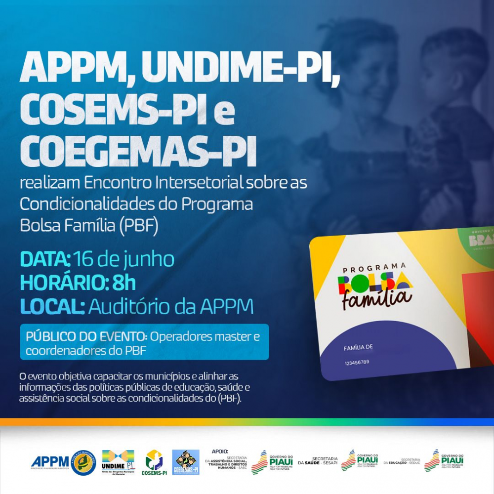 A APPM, em parceria com a UNDIME-PI, o COSEMS-PI e o COEGEMAS-PI estarão promovendo, no dia 16 de junho, a partir das 8h, o Encontro Intersetorial das Condicionalidades do Programa Bolsa família (PBF).