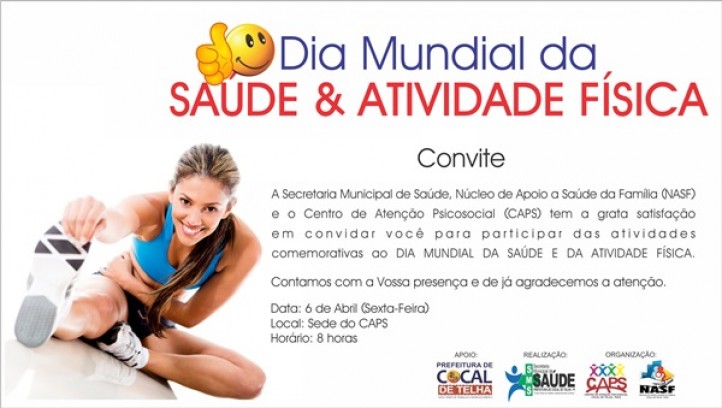 A Secretaria Municipal de Saúde de Cocal de Telha vai realizar nesta Sexta-feira, 06 de abril, diversas atividades para comemorar o Dia Mundial da Saúde e da Atividade Física. A programação acontecerá na sede do CAPS com início previsto para as 8 horas e toda a comunidade é convidada a participar.