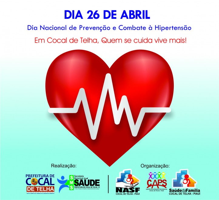 O Núcleo de Apoio à Saúde da Família (NASF), o Centro de Atenção Psicosocial (CAPS) e a Equipe da Estratégia da Família (EFS) da Secretaria Municipal de Saúde e da Prefeitura de Cocal de Telha, preparam para a próxima quinta-feira, dia 26 de Abril, diversas atividades alusivas ao Dia Nacional de Prevenção e Combate a Hipertensão. O objetivo é de conscientizar a comunidade sobre a importância de se prevenir e tratar o tema.