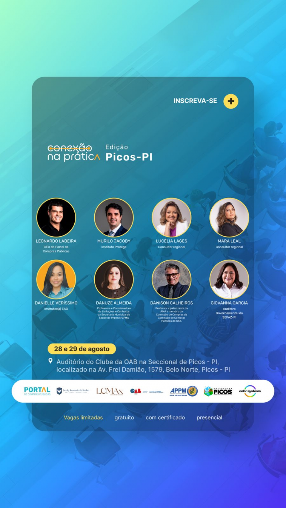 A iniciativa é promovida pelo Portal de Compras Públicas, em parceria com o renomado escritório Jacoby Fernandes & Reolon, a LCMAX – Consultoria e Gestão, a OAB/PI – Subseção de Picos, a APPM – Associação Piauiense de Municípios, a Prefeitura de Picos e a empresa Colors Systems.