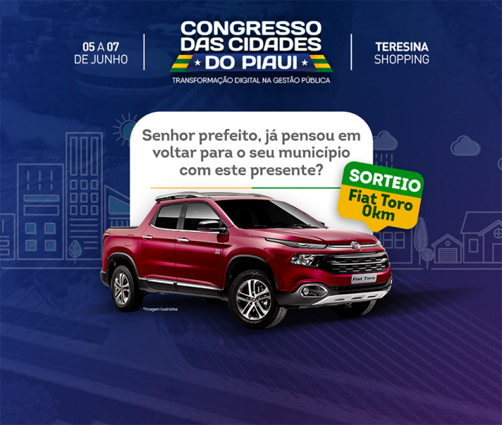 A TV Cidade Verde vai sortear um veículo Fiat Toro entre os gestores municipais que participarão do 3º Congresso das Cidades, que acontece entre os dias 5 a 7 de junho, no Teresina Shopping.