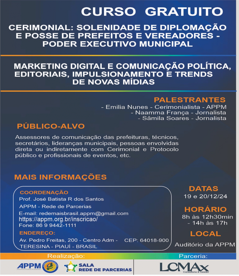 Mais informações e inscrições: redemaisbrasil.appm@gmail.com ou pelos telefones (86) 2107-7906 / 99442-1111.