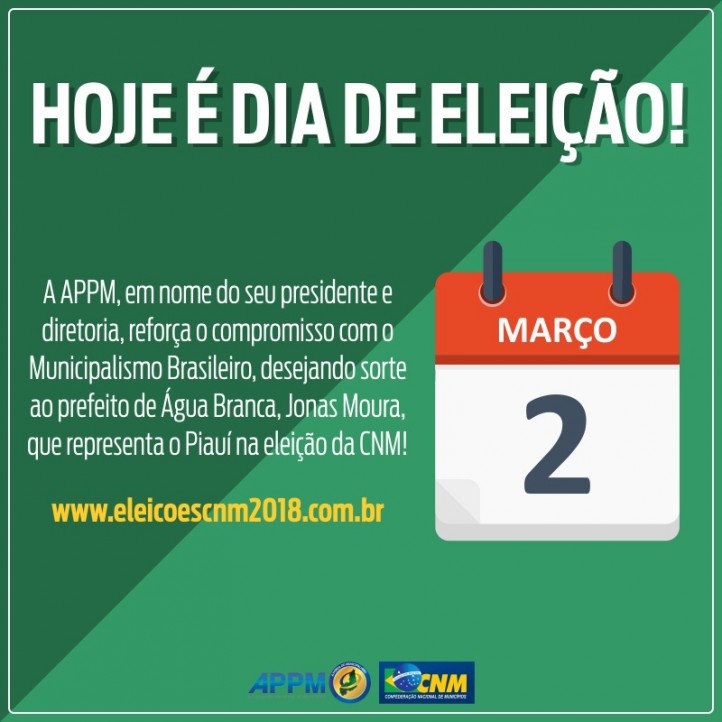 O vice presidente da APPM e prefeito de Água Branca, Jonas Moura, concorre ao cargo de Primeiro Titular do Conselho Fiscal nas eleições, e a APPM conta com o apoio de todos os prefeitos e prefeitas piauienses, que poderão votar pela internet, através do endereço eletrônico www.eleicoescnm2018.com.br, das 08h às 18h.