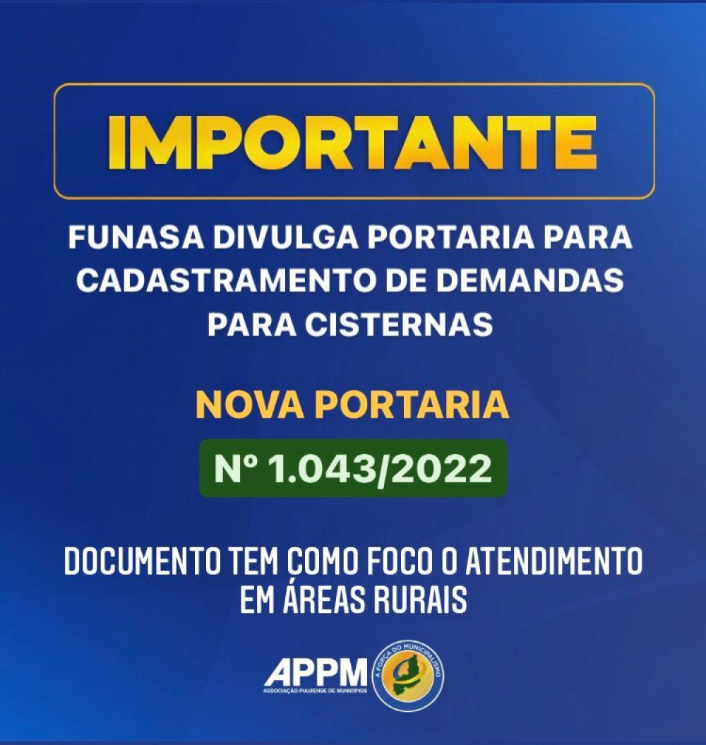 Foi publicada na última sexta-feira (04), no Diário Oficial da União, a Portaria Funasa nº 1.043, de 02 de março de 2022, que estabelece a abertura para cadastramento de demandas existentes por sistemas de captação e armazenamento de água de chuva (cisternas) para consumo humano, em localidades rurais.