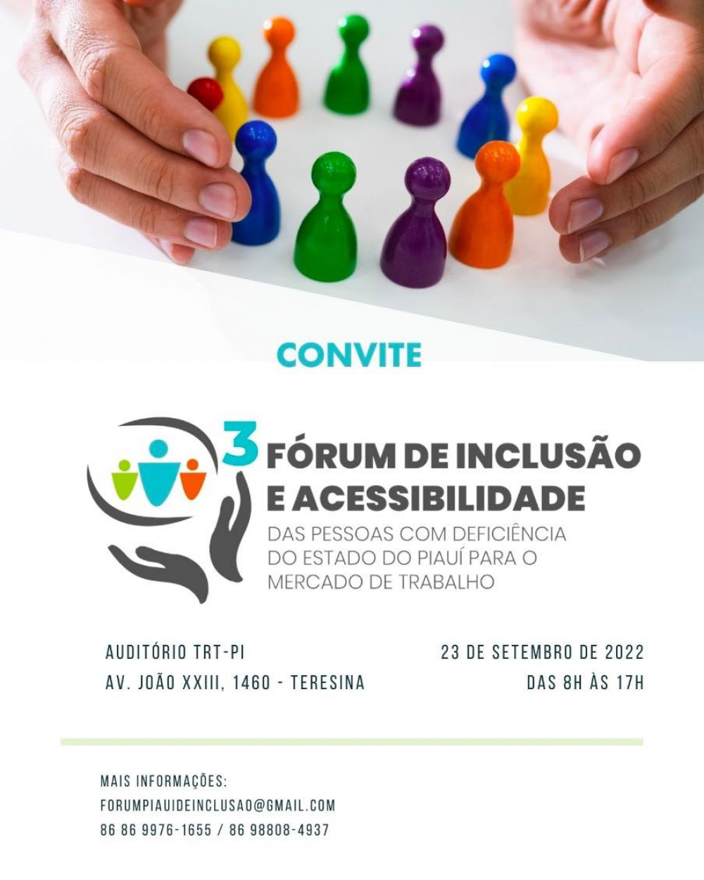 O III Fórum Piauí de Inclusão é um evento que reúne organizações, empresas, profissionais e o poder público para discutirem a acessibilidade e a inclusão das pessoas com deficiência para o mercado de trabalho no estado do Piauí. O encontro acontecerá no Auditório do Tribunal Regional do Trabalho (TRT), no dia 23 de setembro, a partir das 8h, tendo a APPM como parceira.