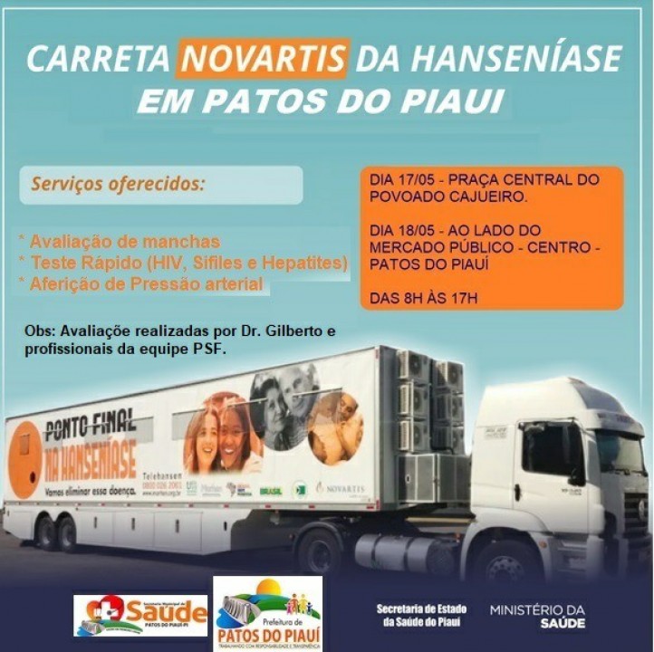 Nos dias 17 e 18 de maio, a Carreta da Saúde estará no município de Patos do Piauí reforçando o combate e a prevenção contra a hanseníase.