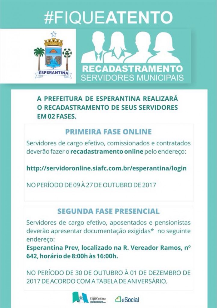 A prefeitura de Esperantina, através da secretaria de administração vai iniciar no próximo dia 09 de outubro recadastramento para todos os servidores, efetivos, comissionados, contratados, aposentados e pensionistas.O recadastramento será realizado em duas fases, onde na primeira os servidores efetivos, comissionados e contratados renovaram seu cadastro através do site: http://servidoronline.siaf.com.br/esperantina/login que será disponibilizado para os servidores. Sendo que na primeira etapa os aposentados e pensionistas não necessitam se cadastrar. A primeira fase vai a partir do dia 09 de outubro até o dia 27 de outubro de 2017.