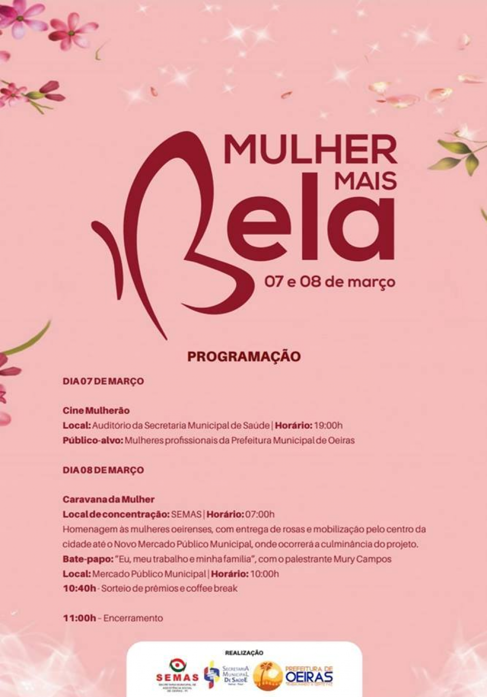 Na sexta-feira (08) a programação tem início às 7h, com concentração na Secretaria Municipal de Assistência Social, tendo uma homenagem às mulheres oeirenses, entrega de rosas e mobilização pelo centro da cidade até o Mercado Municipal Dona Lili, onde ocorrerá a culminância do projeto, com uma palestra motivacional, coffee break e sorteio de prêmios.