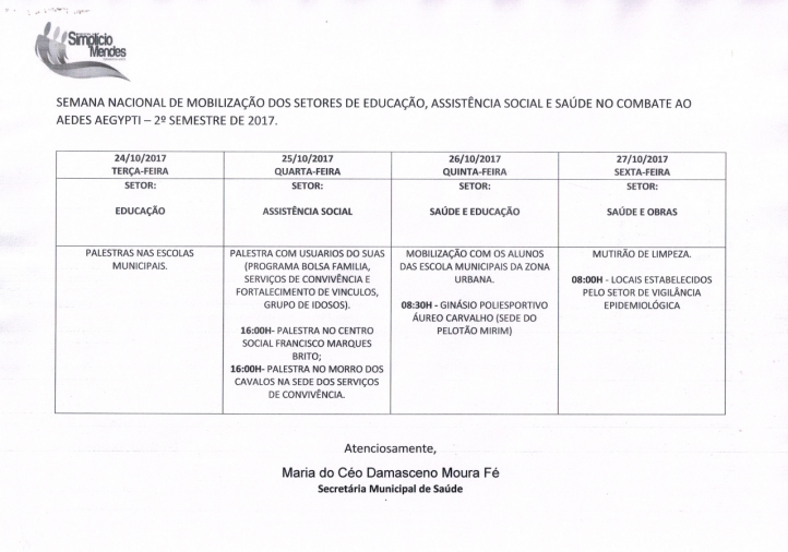 A Prefeitura de Simplício Mendes por meio das Secretarias de Saúde, educação, obras e assistência social, realizam a Semana de Mobilização de Combate aos Criadouros do Mosquito Aedes aegypti, com ações de orientações, controle ao vetor, vistorias em imóveis e distribuição de panfletos. A semana tem início neste dia 24 e vai até sexta-feira (27).
