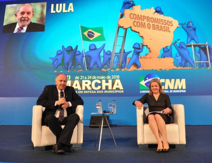 Principal nome do PT para as eleições presidenciais em 2018, Luiz Inácio Lula da Silva enviou carta aos participantes da XXI Marcha a Brasília em Defesa dos Municípios. Lida pela presidente do partido, a senadora Gleisi Hoffmann, na tarde desta quarta-feira, 23 de maio, o documento reforça o compromisso de buscar soluções com os governos locais e lembra a primeira Marcha, em que os prefeitos foram recebidos por cachorros no Palácio do Planalto.
