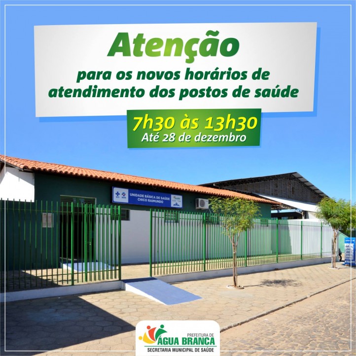 A Secretária Municipal de Saúde de Água Branca informa que houve mudanças nos horários de atendimento dos postos de Saúde. Até o dia 28 de dezembro, o horário será de 7h30 às 13h30.
