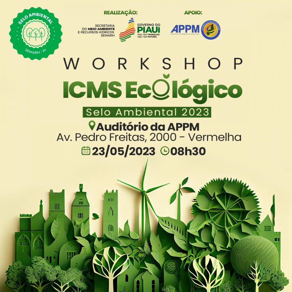 O Governo do Piauí, por meio da SEMARH, e em parceria com a APPM, irá promover, no dia 23 de maio, o Workshop ICMS Ecológico 2023. O evento vai acontecer na sede da APPM, em Teresina, a partir das 8h30, e pretende esclarecer sobre o edital de habilitação e postulação para certificação do selo ambiental e adesão ao ICMS Ecológico.