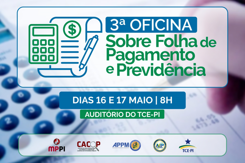 O Tribunal de Contas do Estado do Piauí (TCE-PI), por meio da Diretoria de Fiscalização de Pessoal e Previdência (DFPessoal), em parceria com o Ministério Público Estadual, através do Centro de Apoio Operacional de Combate à Corrupção e Defesa do Patrimônio Público (CACOP), com apoio da Associação Piauiense de Municípios (APPM) e da União das Câmaras Municipais do Estado do Piauí (AVEP), realizará nos dias 16 e 17 de maio, no auditório do TCE, a 3ª Oficina Regional sobre Folhas de Pagamento, no âmbito do projeto de gestão de folhas de pagamento de servidores ativos e inativos.