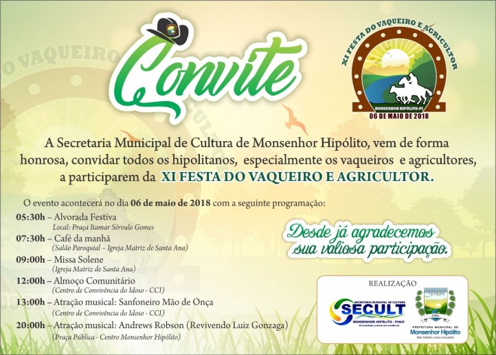 A Secretaria Municipal de Cultura convida todos os hipolitanos, especialmente os vaqueiros e agricultores, a participarem da XI Festa do Vaqueiro e Agricultor e desde já, agradece as suas valiosas participações.