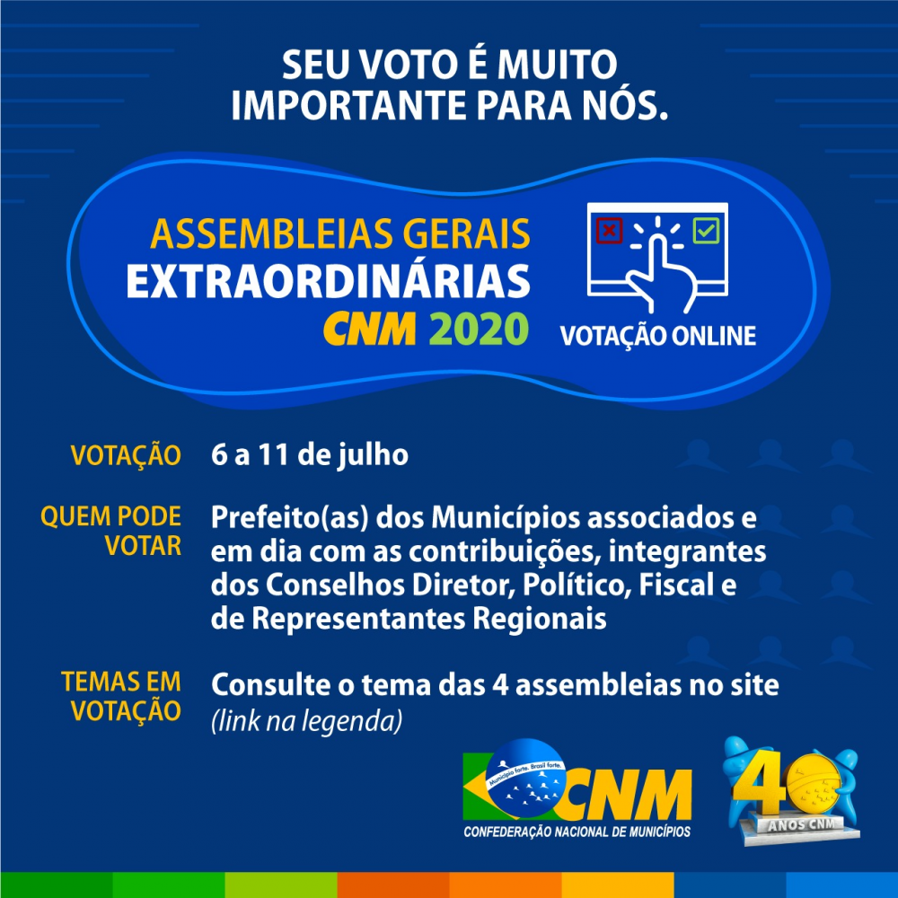 Acontecerão, de 6 a 11 de julho, por meio de videoconferências, as assembleias gerais da Confederação Nacional de Municípios (CNM). Todos os anos, a Confederação realiza assembleia geral, por ocasião da Marcha a Brasília em Defesa dos Municípios. Porém, a Marcha 2020 foi cancelada, por conta da pandemia de Covid-19, e, por isso, as assembleias acontecerão virtualmente.