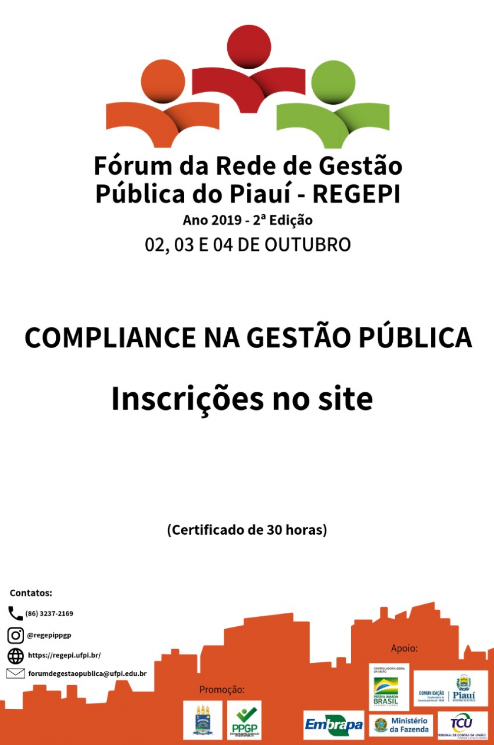 O evento traz como tema “Compliance na Gestão Pública” e será realizado nos dias 02, 03 e 04 de outubro de 2019, na Universidade Federal do Piauí, através do Programa de Pós-Graduação em Gestão Pública. Por Compliance entende-se estar em conformidade com leis e regulamentos, sejam eles internos ou externos, garantindo a legalidade e transparência na função pública.